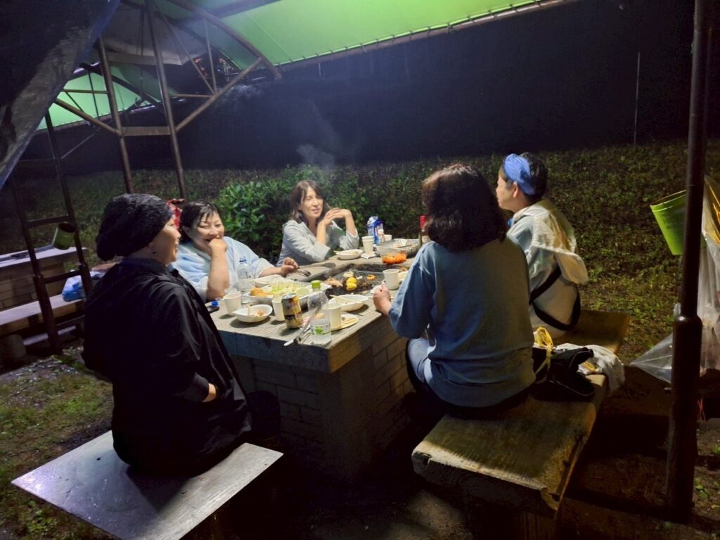 傘をさしてのバーベキューも楽しい思い出にたりました。